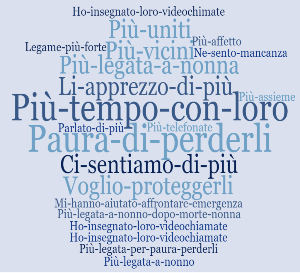 Ma tale rilievo risulta perfino maggiore se si considerano i motivi per cui tali rapporti si considerano peggiorati. Infatti, quelli di gran lunga più frequenti sono: “Non-ci-vediamo-più”, “Mi mancano”, “Mi-manca-abbracciarli”, “Mi-manca-non-vederli”, “Non-posso-visitarli-perché-lontani”, “Non-li-vedo-per-non-contagiarli” “Sto-male-perché-non-li-vedo”, “Mi-manca-il-tempo-con-loro”. Frasi, quindi, in cui la parola più ricorrente, nelle sue diverse sfumature, è ‘mancanza’, seguita dalla preoccupazione per le condizioni di salute dei nonni e dalla paura di contagiarli.