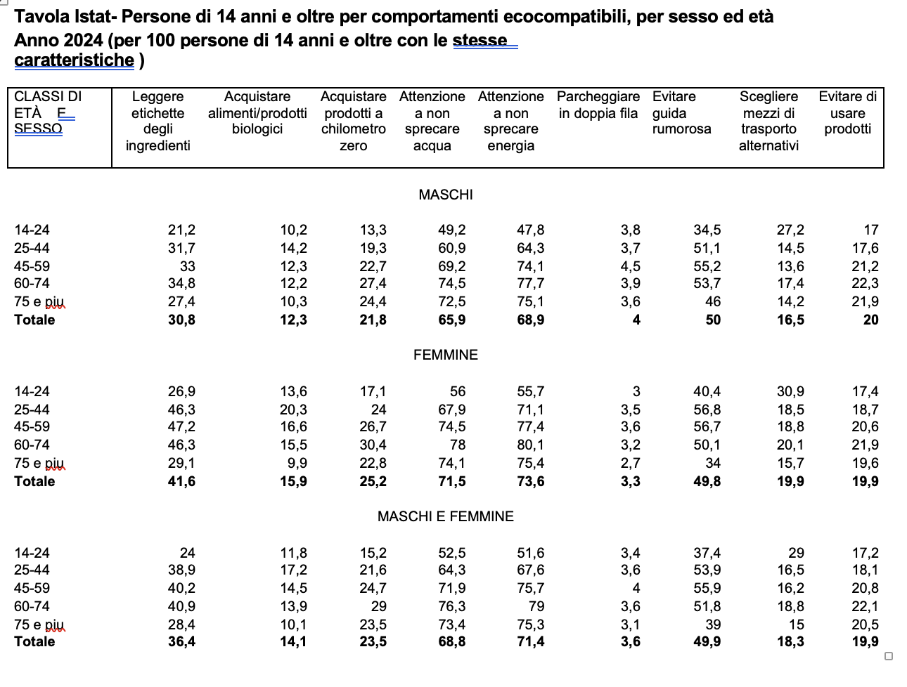 In generale, le persone con un titolo di studio più elevato adottano abitudini più ecocompatibili: tra laureati e chi ha solo la licenza media si registrano differenze significative, ad esempio di 20 punti percentuali nell’abitudine di leggere le etichette dei prodotti, 12,5 punti nell’acquisto di prodotti biologici e oltre 21 punti nei comportamenti legati alla guida responsabile.