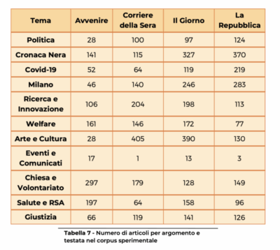 Di seguito, Tabella con numero degli articoli per argomento e testata, tratta dal Report della Ricerca.