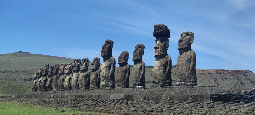 Moai è il nome delle circa 900 iconiche statue dell’isola. Costituite da lava vulcanica, hanno un’altezza media di 4,5 metri e un peso di circa di 5 tonnellate ciascuna. Le loro dimensioni, considerando la tecnologia a disposizione all’epoca, fanno supporre grandi sforzi e sfide logistiche per costruirle e trasportarle. Scolpite tra il 1250 e il 1500, le sculture Moai rappresentano lo spirito dei loro antenati e di personaggi importanti per la loro società.